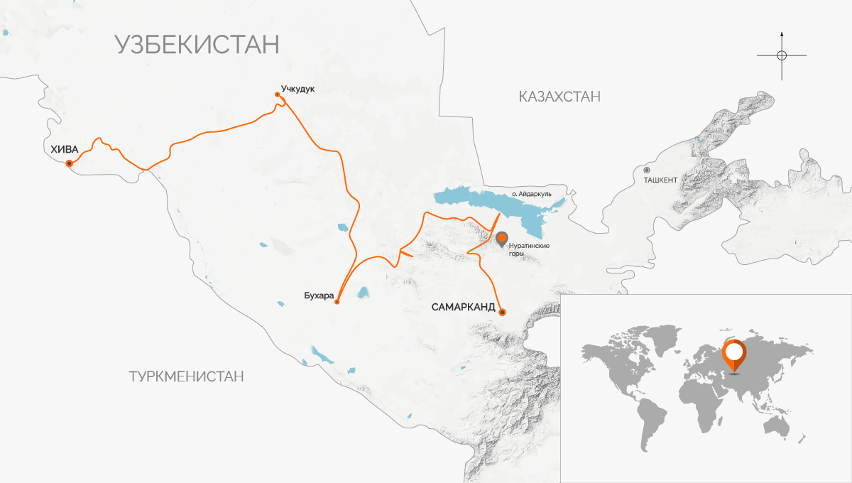 Вам предстоит продолжение внедорожного испытания: более 200 км по пескам и барханам пустыни Кызылкум. Финальной точкой станет Хива — город, который хранит полторы тысячи лет истории Востока, там вы увидите стены Ичан-Калы и почувствуете атмосферу древнего восточного наследия.